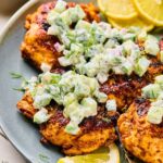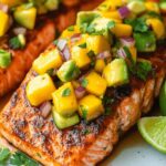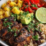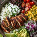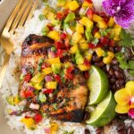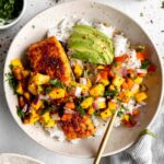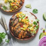 • Cilantro lime chicken served over fragrant jasmine rice, complemented by a vibrant mango salsa and fresh lime wedges