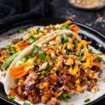 • Korean turkey tacos with a zesty teriyaki sauce, sweet cabbage and carrot slaw and topped with green onions and creamy sriracha cilantro aioli