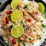 • Chipotle Chicken with Rice, accompanied by a tangy elote salad and fresh lime wedges