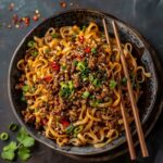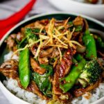 • Tender beef stir-fried with fresh broccoli florets in a savory soy-garlic sauce, served over steamed jasmine rice