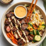 • Korean Steak BBQ Bowl served with aromatic Jasmine Rice and topped with a zesty Creamy Sriracha Sauce with a side of cucumber salad and shredded carrots