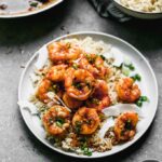• Shrimp smothered in a homemade sweet and spicy sauce topped with scallions and sesame seeds accompanied with fluffy rice and a carrot/cabbage slaw