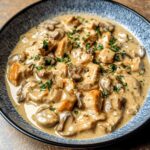 • Creamy chicken Dijon, featuring tender chicken in a rich mustard sauce, served alongside velvety mashed potatoes and honey garlic roasted carrots