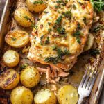 • Lemon garlic salmon paired with creamy mashed potatoes and roasted Brussels sprouts