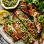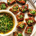 • Juicy flank steak topped with vibrant chimichurri sauce, served alongside creamy yuca mash and Brussels Sprouts