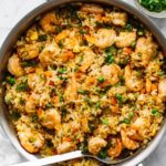 • Succulent shrimp scampi served over aromatic lemon herb rice, infused with vibrant garlic and fresh parsley