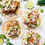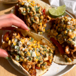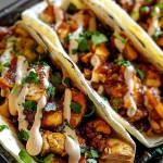 • Honey BBQ chicken flour tacos drizzled with a luscious garlic butter sauce, topped with crisp coleslaw for a delightful crunch