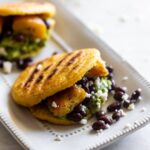 • A Venezuelan sweet corn cachapa filled with melted mozzarella cheese, perfectly complemented by a refreshing black bean salad