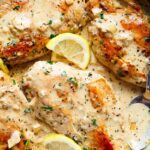 • Tender chicken breast smothered in a rich and flavorful lemon pecorino sauce, served with cheesy mashed potatoes and oven roasted Brussels sprouts