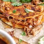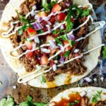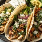 • Tender shredded chicken with a flour tortilla with tangy pickled red onions, and queso blanco, black beans with a flavorful creamy chimichurri sauce