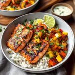 • Garlic herb salmon drizzled with green goddess dressing, served with a bright tomato salad and fragrant jasmine rice