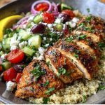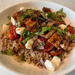 • Grilled Chicken in Mediterranean spices with garlic infused quinoa and a cherry tomato, red onion, feta cheese and cucumber salad topper with a harissa aioli.