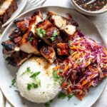 • Ginger garlic chicken paired with a refreshing carrot and cabbage slaw, served alongside fluffy steamed rice