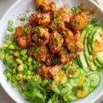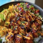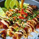 • Savor tender sweet chili chicken served over fluffy white rice, topped with a refreshing coconut lime drizzle, alongside a crisp cucumber and shredded carrot salad