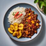 • Tender and flavorful chicken stewed in a savory tomato-based sauce, served with fluffy white rice and sweet plantains