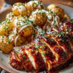 • Tender steak topped with a vibrant green sauce, served with creamy sweet mashed potatoes, and complemented by roasted Brussels sprouts drizzled with a garlic balsamic glaze