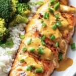 • Tender salmon fillets glazed with a sweet ginger sauce, served over a bed of fluffy rice and accompanied by vibrant steamed broccoli