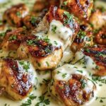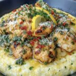 • Juicy Southern-style chicken served over creamy grits, complemented with rich garlic sauce and a sprinkle of green onions for garnish