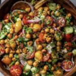 • Zesty Mediterranean salad with chickpeas, cherry tomatoes, feta, red onions, cucumbers, and a vibrant mix of spinach and kale, drizzled with lemon-infused olive oil.