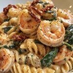 • Fusilli paired with succulent shrimp, vibrant spinach, and sun-dried tomatoes in a creamy garlic-infused sauce