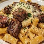 • Succulent steak and rigatoni tossed in a velvety garlic parmesan cream sauce