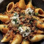 • Savory ground turkey and ricotta stuffed shells in a creamy marinara sauce, garnished with fresh basil