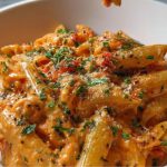 • Creamy penne pasta tossed in a vodka-infused tomato sauce, sprinkled with parmesan herb breadcrumbs