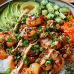• Garlic marinated shrimp on a bed of fluffy jasmine rice and a cucumber and shredded carrot salad drizzled with spicy mayo