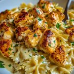 • Farfalle pasta in a luscious creamy lemon parmesan sauce topped with juice chicken and parmesan cheese
