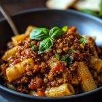 • Slow simmered lentil bolognese made with tender lentils, aromatic herbs, crushed tomatoes, carrots, and celery on a bed of rigatoni topped with parmesan cheese- a comforting twist on a classic Italian favorite
