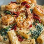 • Rigatoni tossed in a luscious Alfredo parmesan cream sauce with spinach and sun-dried tomatoes topped with juicy seasoned shrimp