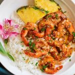 • Succulent Hawaiian style sweet and garlic shrimp served over a bed of fluffy white rice, accompanied by a side of sweet and juicy pineapple salsa