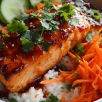 • Deliciously glazed grilled salmon with a flavorful teriyaki sauce served alongside carrots with fragrant rice