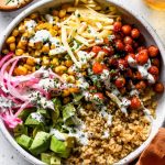 • BBQ glazed chickpeas, garlic infused quinoa paired with corn, pickled onions and creamy ranch dressing